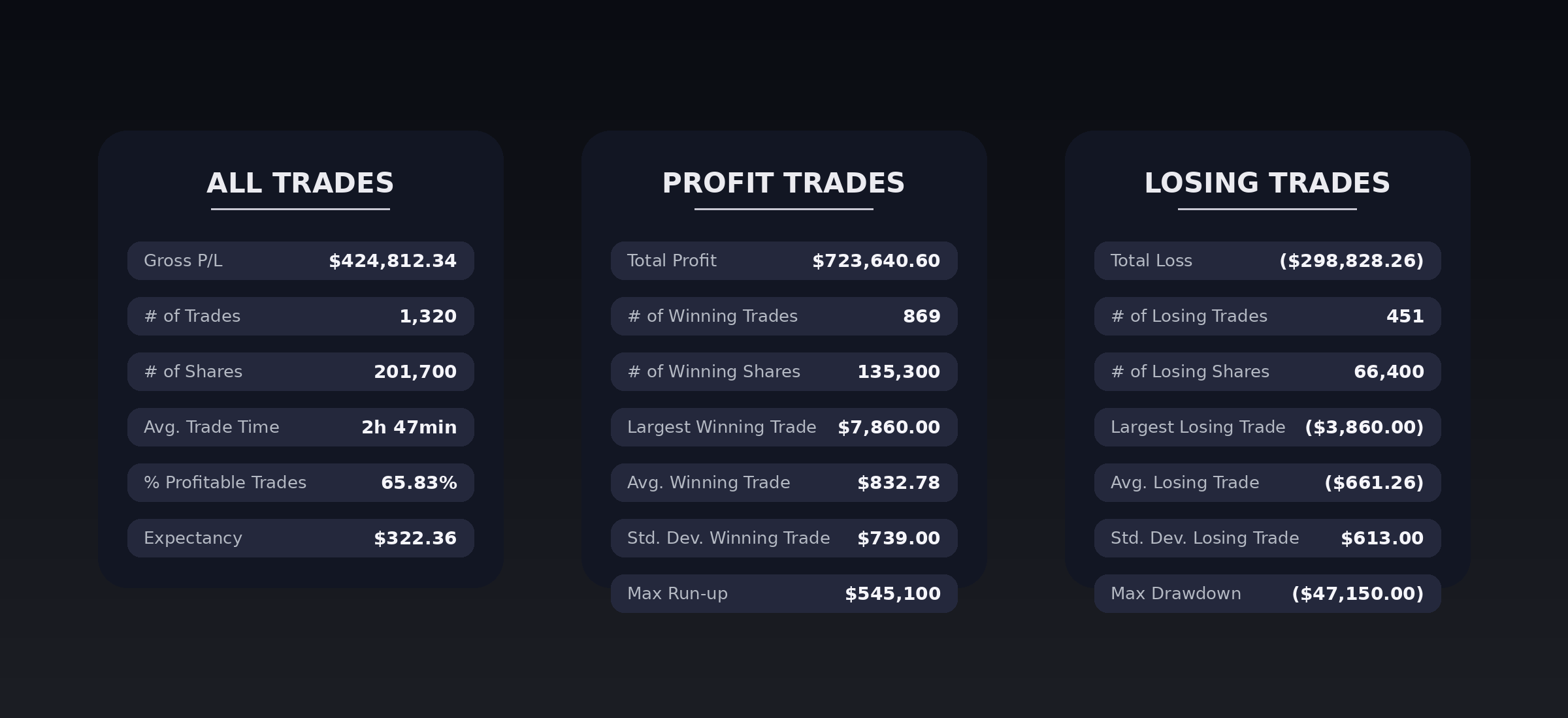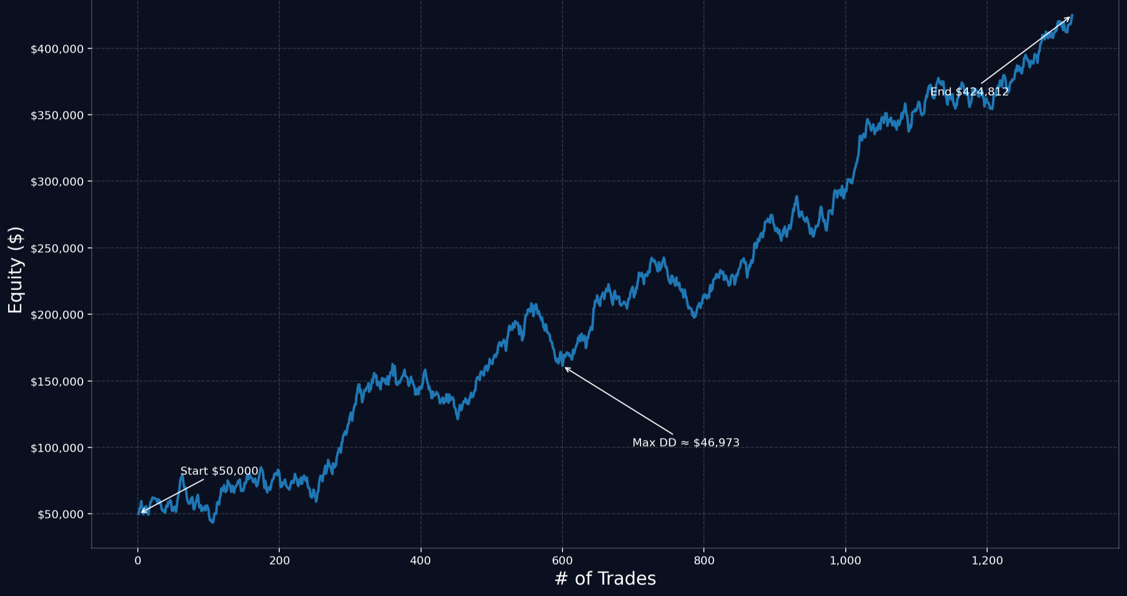 Starting capital: $50K Gross P/L: $424,812 Year: 2020-2026
